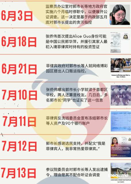 郭市长目前还面临司法部针对突袭网络博彩中心的人口贩运投诉。菲国家调查局(NBI)此前证实郭爱丽(Alice Guo)和中国护照持有者郭华萍有相同的指纹。